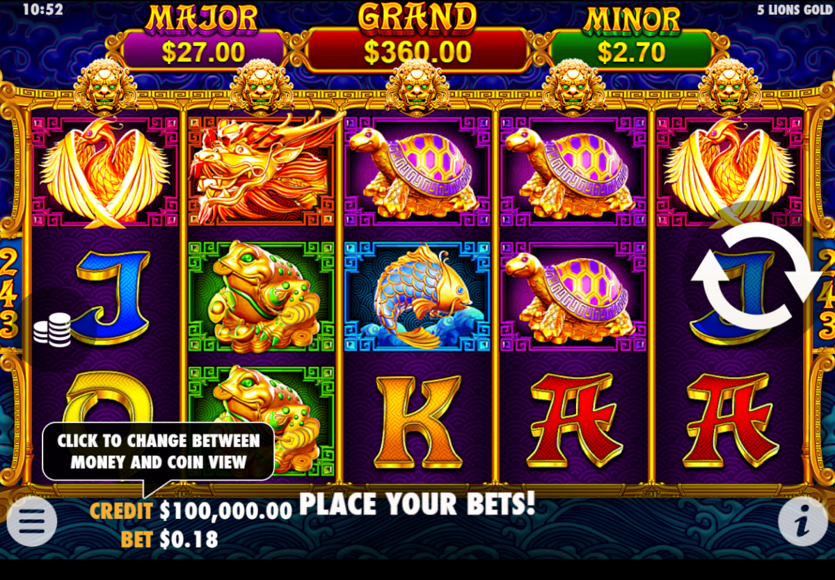 Todos los jugadores que deseen probar la tragamonedas de video 5 Lions Gold pueden apostar entre 0,18 y 90 monedas por giro.
