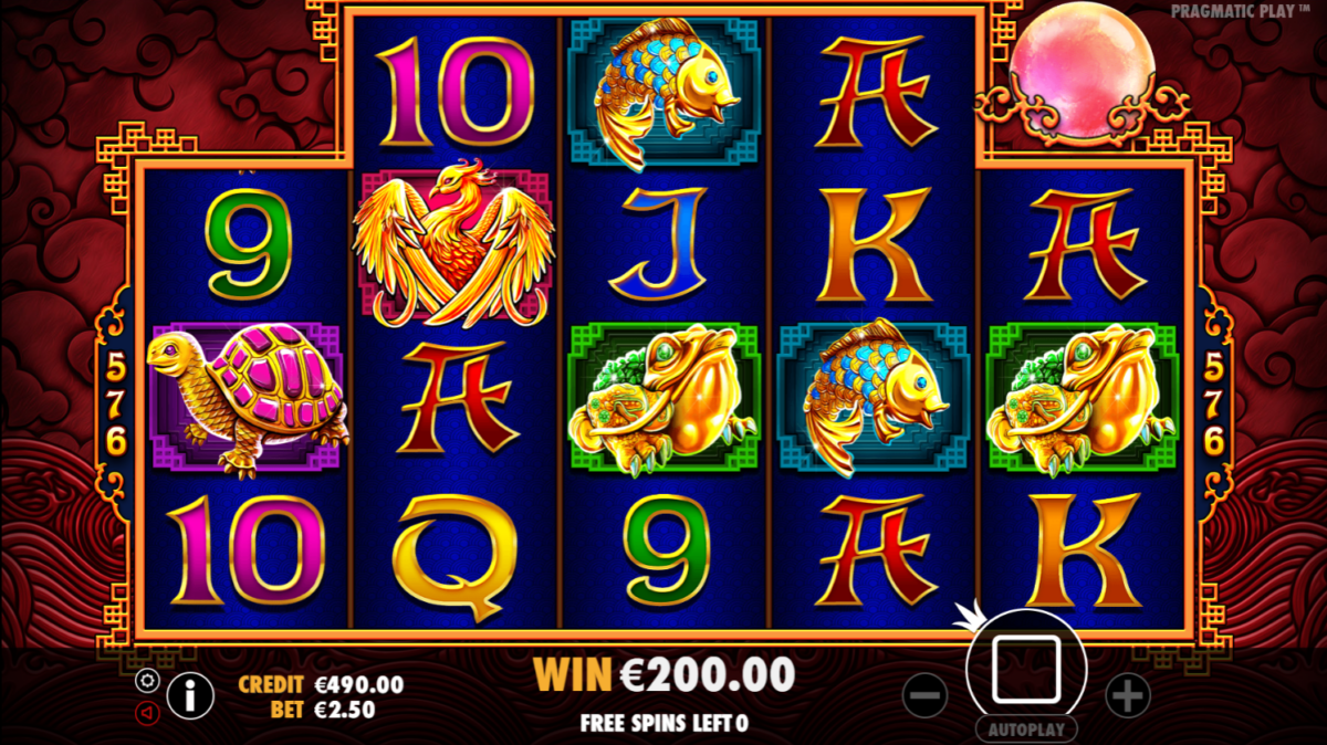 Si el jugador alinea cinco símbolos del ave fenix o el sapo de oro en los carretes, recibirá un pago de hasta 8.000 monedas. Se da un premio de hasta 1.000 monedas por conseguir 4 símbolos idénticos. Mientras que se da un pago de hasta 350 monedas por conseguir 3 símbolos idénticos.