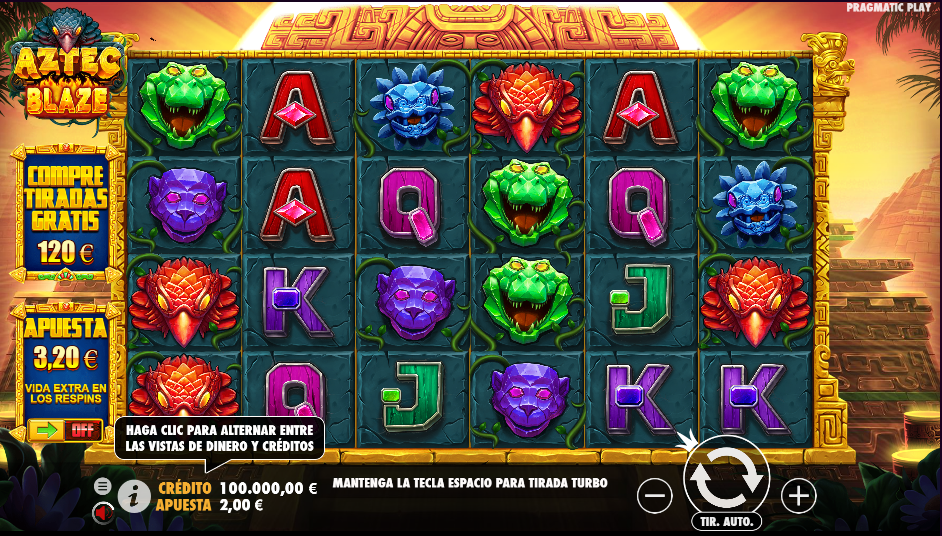 La tragamonedas Aztec Blaze de Pragmatic Play tiene 6 carretes y 25 líneas de pago. Al estar en el hemisferio sur, es probable que adivines que esta tragamonedas te llevará al centro del México actual, la región de Mesoamérica. Puedes ir a la búsqueda del tesoro de los artefactos aztecas con dinero real en cualquier casino de Pragmatic Play, o puedes jugar gratis aquí mismo.