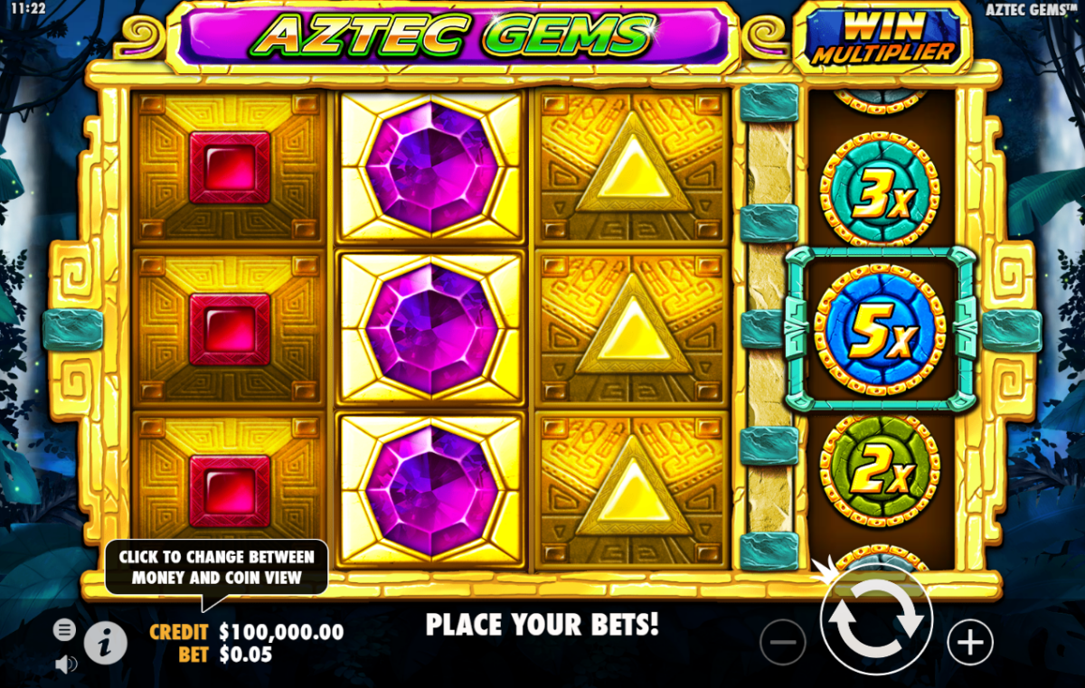 Aztec Gems es un fantástico juego con una cuadrícula tradicional de 3×3 y 5 líneas de pago fijas. Este juego de tragamonedas de video de Pragmatic Play tiene un tema azteca, como lo indica el título. Las apuestas van de 0.05 monedas como mínimo a 25 monedas como máximo.