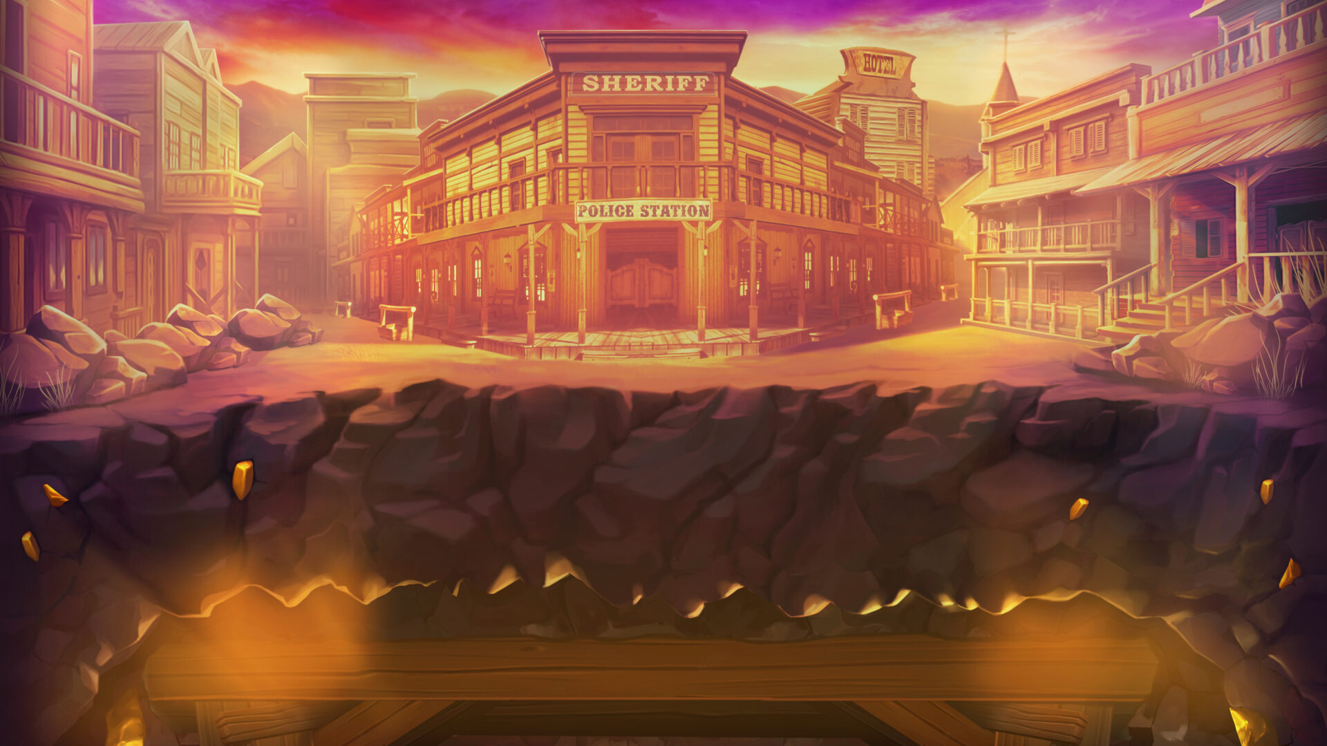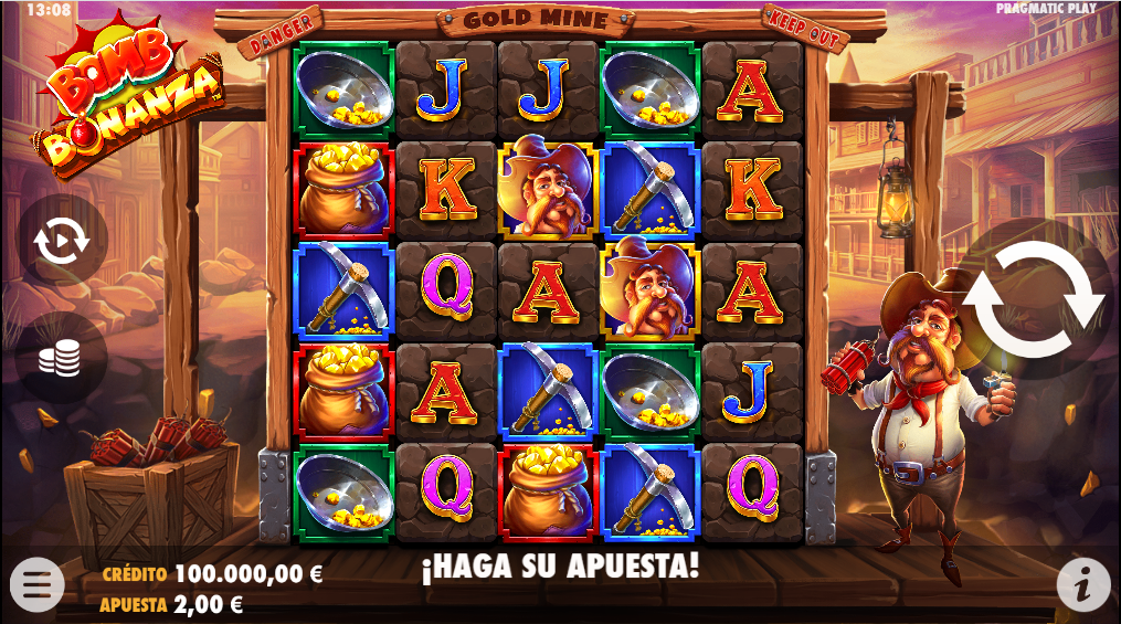 Lleva a los jugadores en sus aventuras mineras en busca de tesoros, una parte esencial de tragamonedas con este tema. En Bomb Bonanza, un personaje sostiene la dinamita y un mechero en el lado derecho de la cuadrícula. Este no es el caso de todas las tragamonedas mineras, pero es bastante común. Una nueva caja de explosivos se encuentra en el extremo izquierdo de la cuadrícula. Mientras que un paisaje urbano de madera que recuerda al salvaje Oeste sirve de telón de fondo.