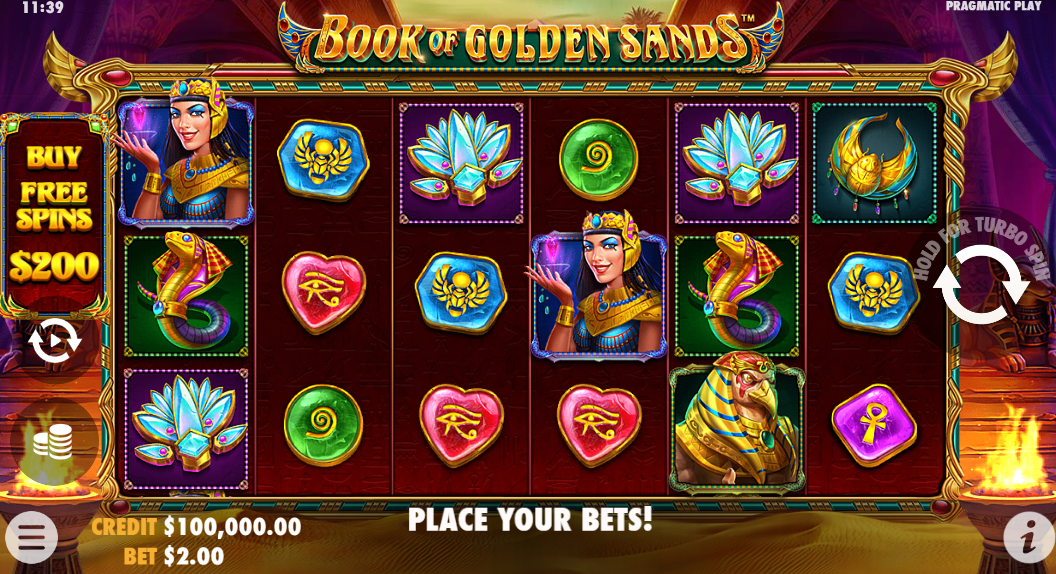 En esta tragamonedas, se crearon once símbolos diferentes de pago estándar. Seis iguales en cualquiera de los cinco primeros símbolos de pago bajo, que te harán ganar entre 1,25 y 1,5 veces tu apuesta. Tres artículos de joyería y tres símbolos de personajes conforman el siguiente nivel de pagos, ofreciendo de 2 a 5 veces la apuesta por un full del mismo símbolo. Book of Golden Sands es inusual porque cuenta con un símbolo de comodín que puede sustituir a cualquier otro símbolo de los rodillos, excepto al de la izquierda.