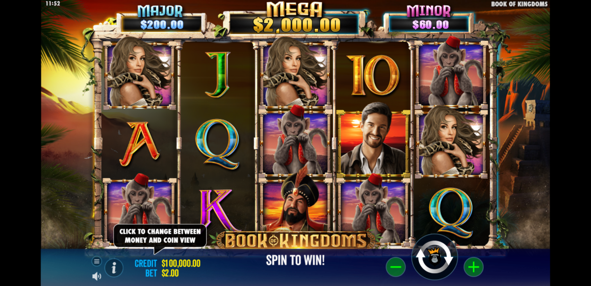 Book of Kingdoms siempre es entretenido de jugar por la variedad de personalidades que te encontrarás. Hay un humano, un sultán, una dama y un mono. Estos iconos son los símbolos de pago habituales de las tragamonedas, y pagan en varias combinaciones basadas en el icono y el número de veces que aparece en una línea de pago. Los símbolos básicos de naipes A, K, Q, J y 10 forman el segundo grupo de símbolos. Estos son los iconos de menor pago del juego, con pagos que varían en función de los símbolos que aparecen en una línea de pago ganadora.