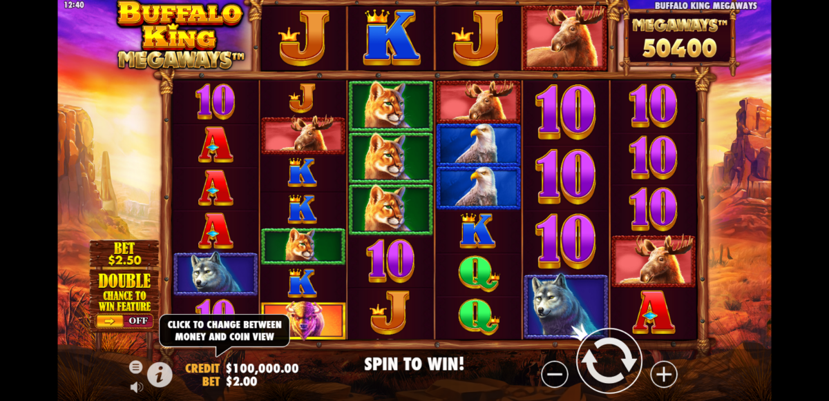 Buffalo King Megaways de Pragmatic Play es una tragamonedas de video de 6 carretes y 2 a 8 filas. El concepto Megaways del juego, que permite un número aleatorio de filas por tirada, también es responsable de la aleatoriedad del número de líneas de pago que aparece en los carretes después de cada tirada. La apuesta mínima es de 0,20 y la máxima de 125. En su juego base, Buffalo King Megaways tiene un porcentaje de retorno al jugador (RTP) del 96,52%; con la opción Bonus Buy activada, el RTP baja al 96,50%. Tiene un gran potencial de pago de hasta 5.000 veces la apuesta para un jugador afortunado.