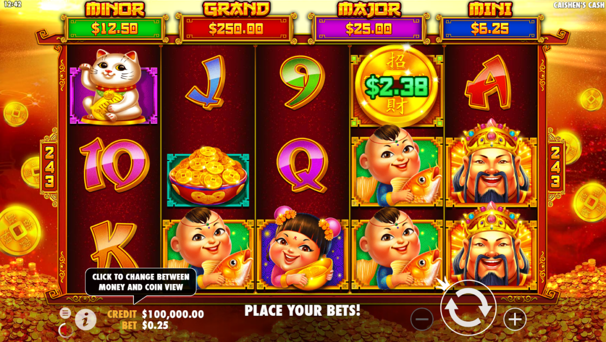 La tragamonedas de Pragmatic Play, Caishen’s Cash, es la secuela del exitoso juego Caishen’s Gold. Este juego ofrece una cuadrícula de 5×3 y 243 líneas de ganancia, esto último poco habitual en las tragamonedas. Las apuestas en las tragamonedas de Pragmatic Play pueden ir desde 0.25 monedas por giro hasta 125 monedas por giro.