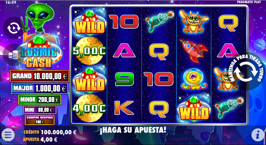 Cosmic Cash es una nueva tragamonedas de casino en la que volamos al espacio y participamos en una aventura cósmica entre alienígenas. Es un lugar colorido en el que hemos aterrizado entre los grandes planetas donde pueden ayudarnos a conseguir ganancias de hasta 2650X la apuesta.