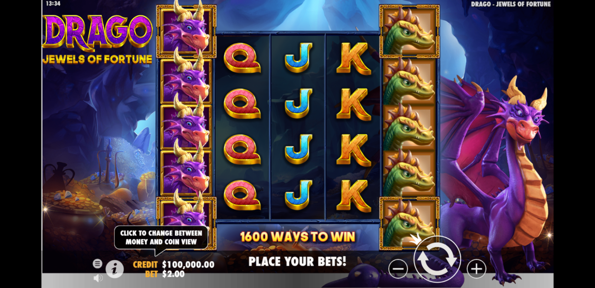 Una resplandeciente cuadrícula de juego 5 y 4 con 1.600 líneas de pago es visible tras una sola jugada en la tragamonedas Drago Jewels of Fortune. El modo de bonus Streak Respin, la ronda de giros gratis, que ofrece premios espectacularmente mayores, cambios de símbolos, wilds pegajosos y mucho más, son sólo algunas de las muchas y emocionantes características del juego.