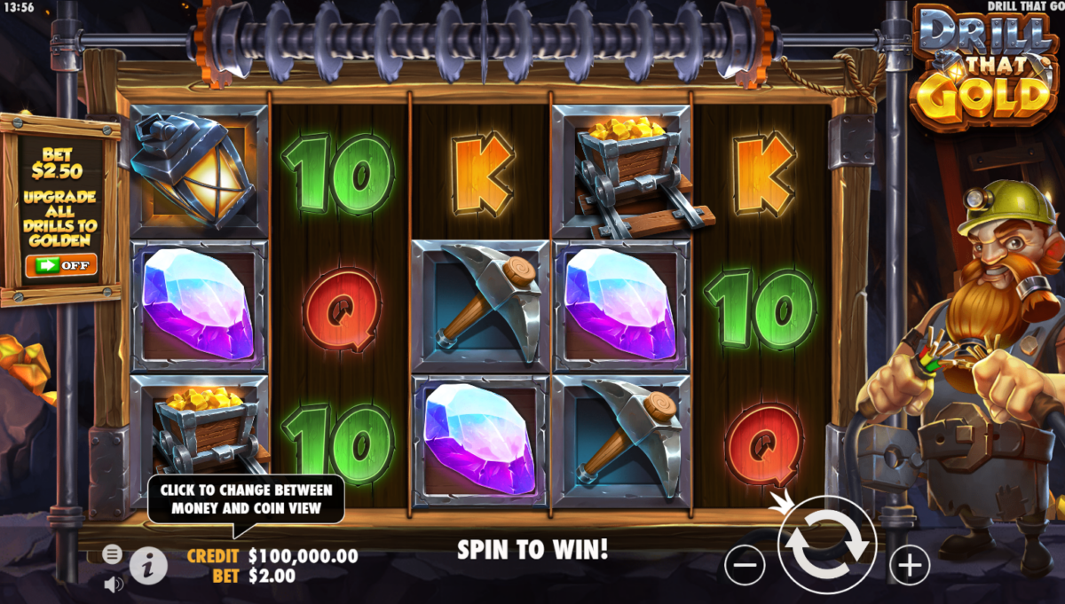 Drill That Gold es una las máquinas tragamonedas más divertidas de Pragmatic Play. Así mismo, ha sido diseñada para que los jugadores puedan cavar sus recompensas directamente desde la mina. Con sus gráficos divertirá a cualquiera que se atreva a llevar la acción bajo tierra. Finalmente, otro aspecto clave a tener en cuenta es el premio máximo que puede llegar a ser de hasta 5.000 veces el total de tu apuesta.