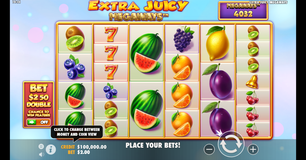 La tragamonedas de video Extra Juicy Megaways de Pragmatic Play tiene 6 carretes y de 2 a 7 filas. Debido al mecanismo Megaways del juego, que ofrece a los jugadores hasta 117649 formas de ganar, el número de filas puede variar, como en Starz Megaways. Puedes elegir entre una apuesta mínima de 0,20 y una máxima de 100. Hay un RTP superior a la media en esta tragamonedas, con un RTP del 96,42% y un pequeño aumento al 96,48% cuando se utiliza la opción de compra de bonus. Con una alta volatilidad, podrías ganar hasta 5000 veces tu apuesta inicial es esta.