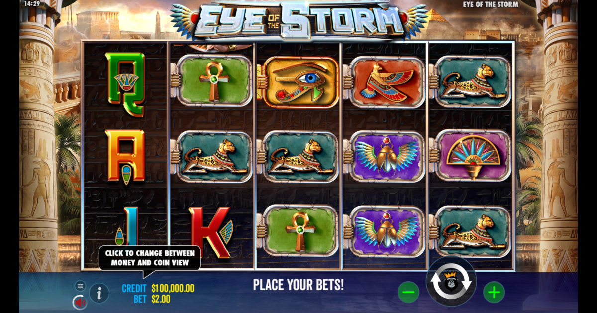 Eye of the Storm es una tragamonedas de 53 carretes de Pragmatic Play ambientada en el antiguo Egipto, en la época en que Cleopatra gobernaba el poderoso reino. El tema egipcio y las animaciones están muy bien hechos, dando vida a la hermosa reina.