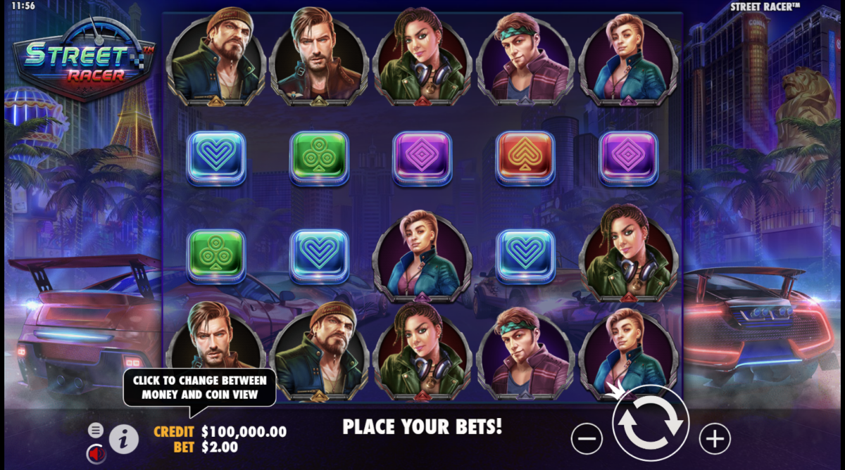 Las tragamonedas Street Racer de Pragmatic Play tienen una divertida temática de carreras de aceleración y ofrecen una emocionante experiencia de juego virtual. La acción se desarrolla en el Strip de Las Vegas, con edificios emblemáticos y una pista llena de coches esperando. Los símbolos de alto pago muestran una variedad de conductores, cada uno con su propia ventaja única. Como resultado, Street Racer es un juego visualmente impresionante con una premisa única y refrescante.