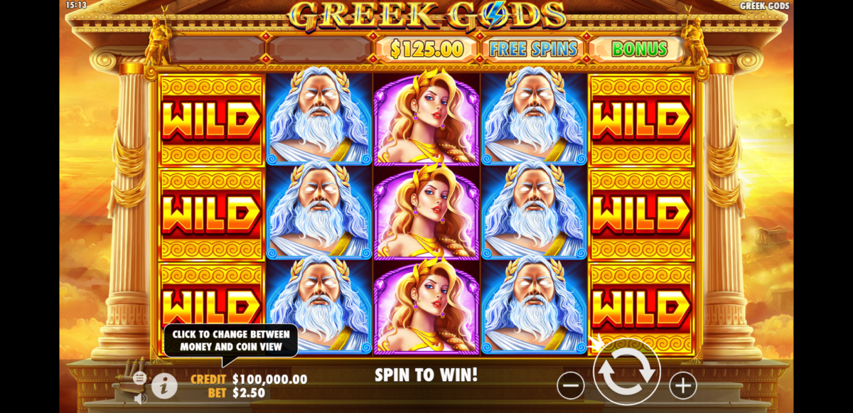 Greek Gods, tiene como temática los animales fantásticos y los héroes de la antigua Grecia, así como la naturaleza del mundo y otros cuentos de fábula. La tragamonedas tiene una alta RTP del 96,5%, 5 carretes y 243 formas de ganar. La volatilidad del juego va de leve a alta, y al igual que Lucky Lightning, la apuesta máxima es de 125 créditos en cada tirada.