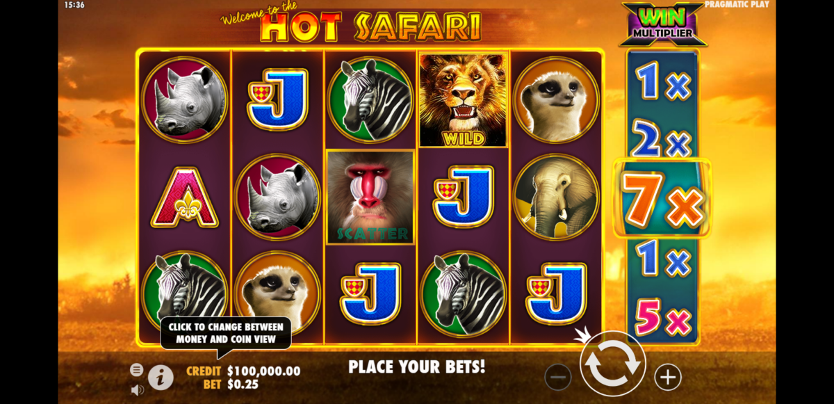 Hot Safari de Pragmatic Play es una tragamonedas online que se adhiere a la probada estructura de 5 carretes y 3 líneas de pago. Esta tragamonedas, ofrece un total de 25 líneas de pago fijas. Los carretes expansibles, los giros gratis y los multiplicadores wild son algunas de las características del juego, y puedes ganar hasta 10.000 veces tu apuesta inicial.