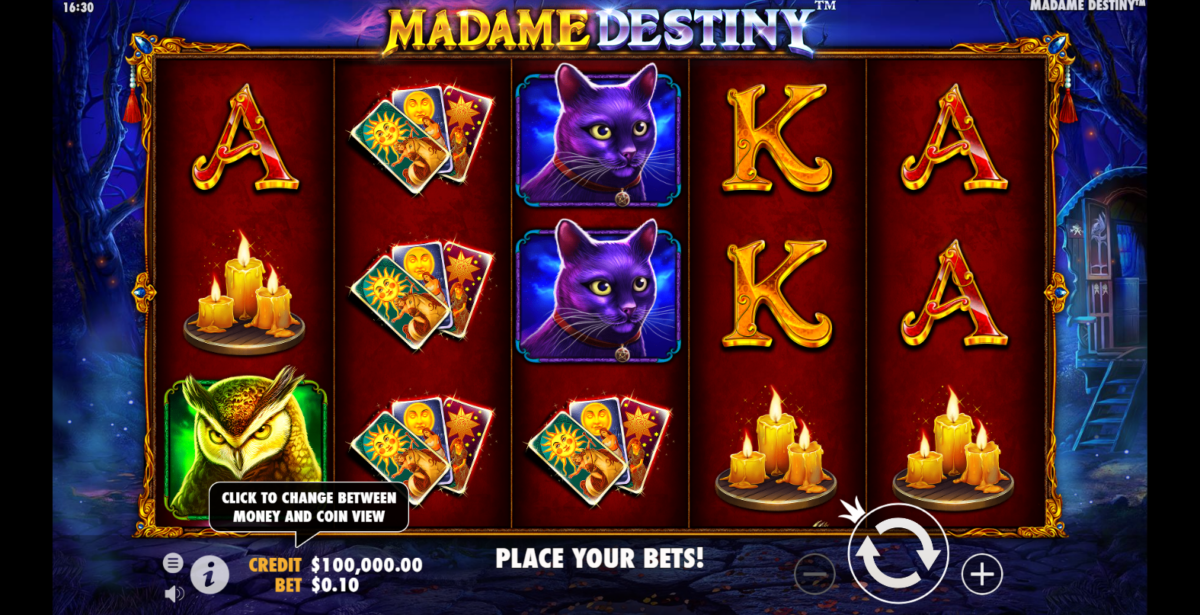 Se espera que los símbolos implementados sean coherentes con el tema místico del juego. Hay un total de 13 de ellos, y podemos identificar 6 símbolos de bajo pago entre ellos. Aun así, puedes ganar a lo grande con los símbolos scatter y wild, que son un orbe mágico y Madame Destiny, respectivamente. El Búho y el Gato, por su parte, ofrecen premios adicionales proporcionales al salario pagado por el jugador.