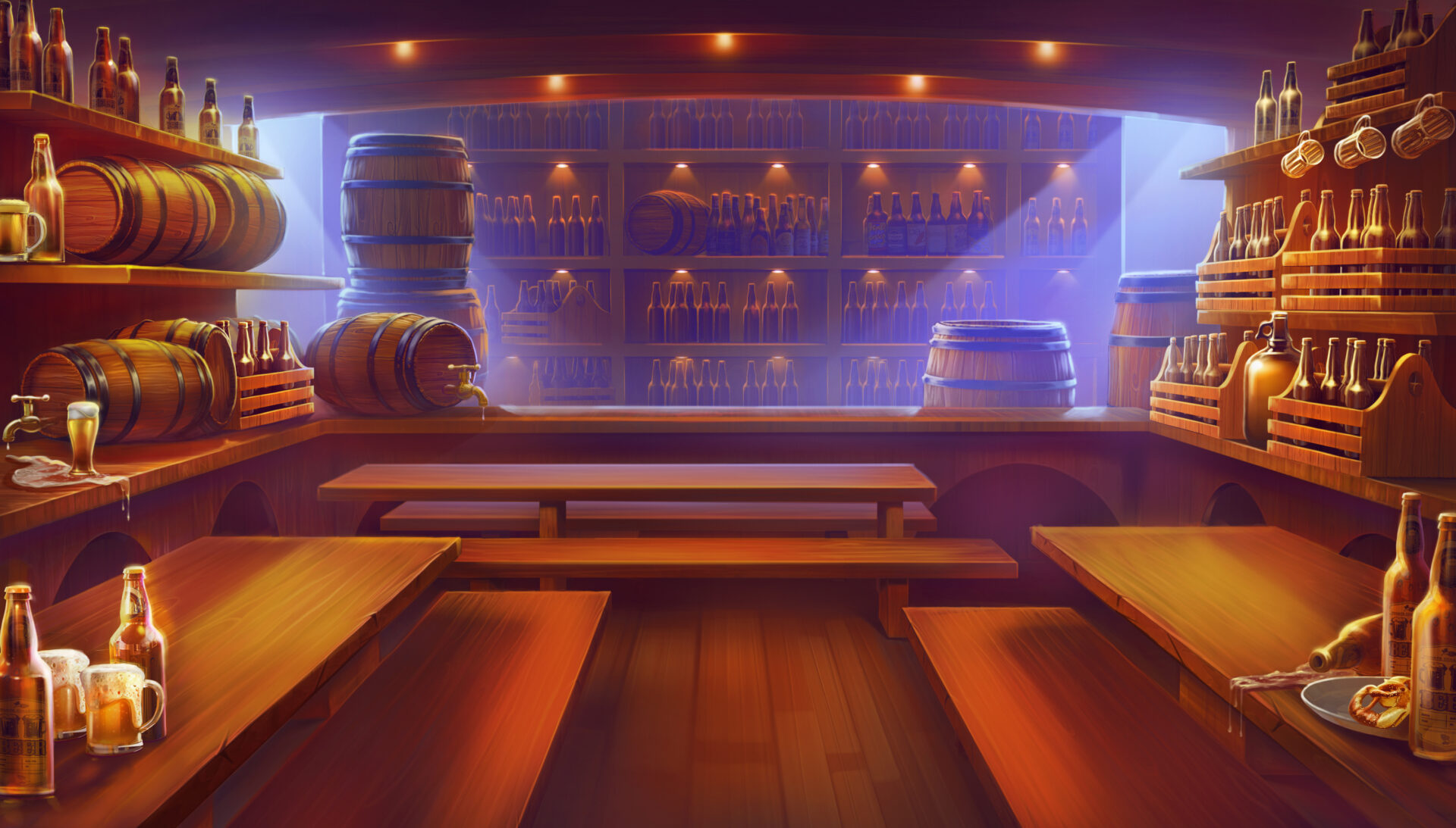 En términos de presentación, este juego promete mucho. Los elegantes carretes verdes están colocados en marcos de madera coloridos, de diseño único y tallados de forma intrincada. Hay, por supuesto, estantes detrás del mostrador repletos de vasos y copas. Además, hay música tradicional alemana y una animada multitud para disfrutar.
