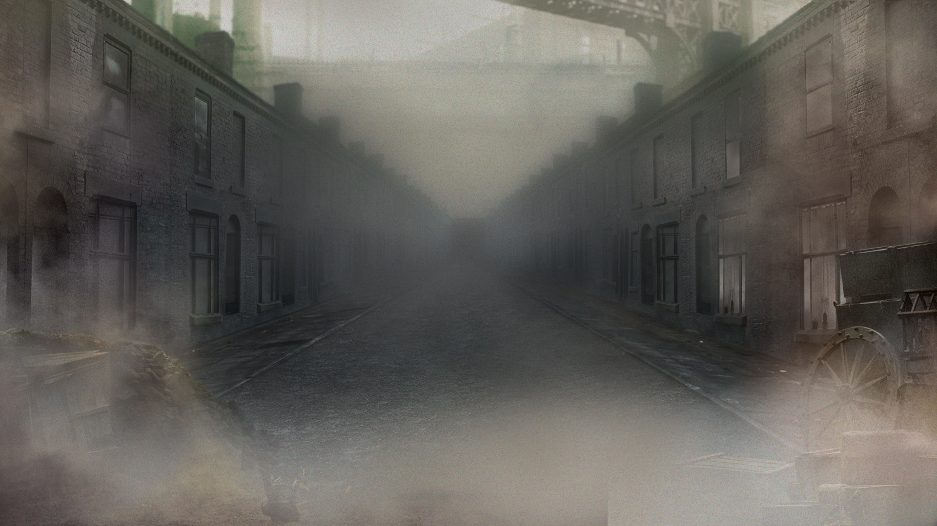 De fondo se ven las calles de Birmingham a principios de los años cincuenta. El uso del blanco y negro es un intento deliberado de recrear la atmósfera de la época. Abundan los edificios y los carruajes, que eran el principal medio de transporte en aquella época.