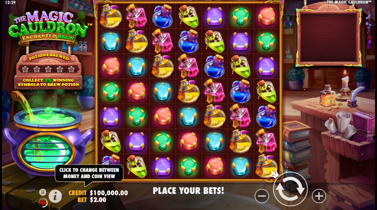 Durante siglos, el caldero ha sido el recipiente ideal para preparar pociones de encantamiento, en las que los sabios echaban lo que creían que sería el secreto de su éxito. Como bonus, funciona de maravilla en la cocina, y era un ingrediente básico en los interminables sopas de la Europa medieval. Una cuadrícula de 7×7 se llena con 49 símbolos en cada tirada, y el escenario es una habitación densamente arbolada con regentes, pergaminos y velas. El juego tiene un ambiente mágico, cálido y acogedor, que se ve realzado por la banda sonora.