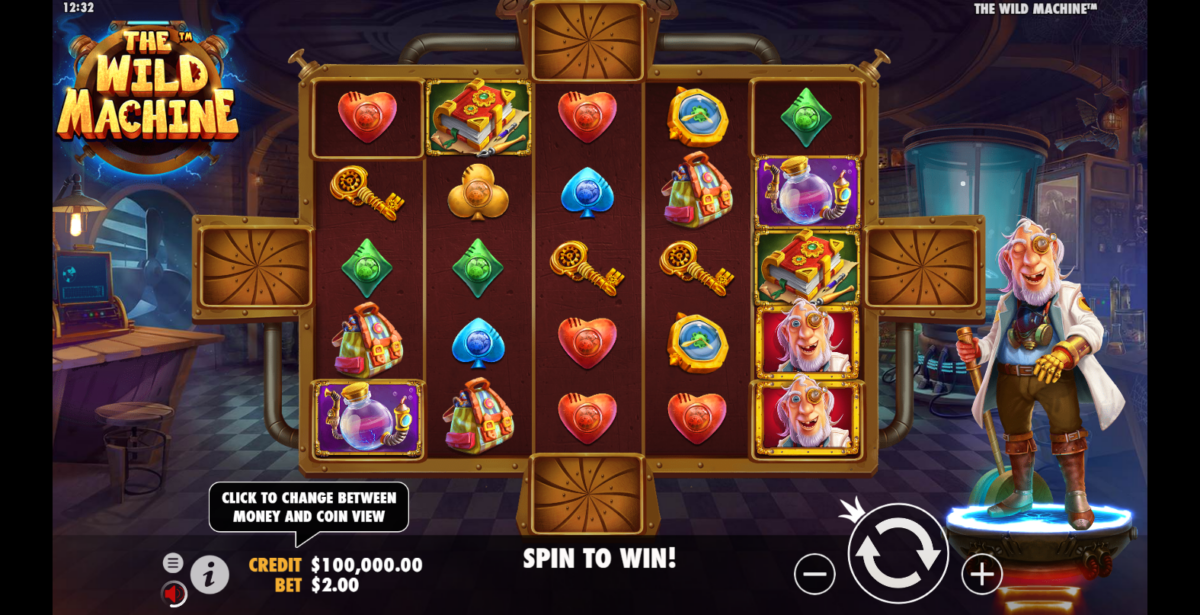 En la tragamonedas The Wild Machine de Pragmatic Play, vivirás una emocionante excursión al laboratorio de un científico loco. Los carretes están rodeados de diversos equipos del futuro, y su inventor aparece de pie en una plataforma sobre los carretes.