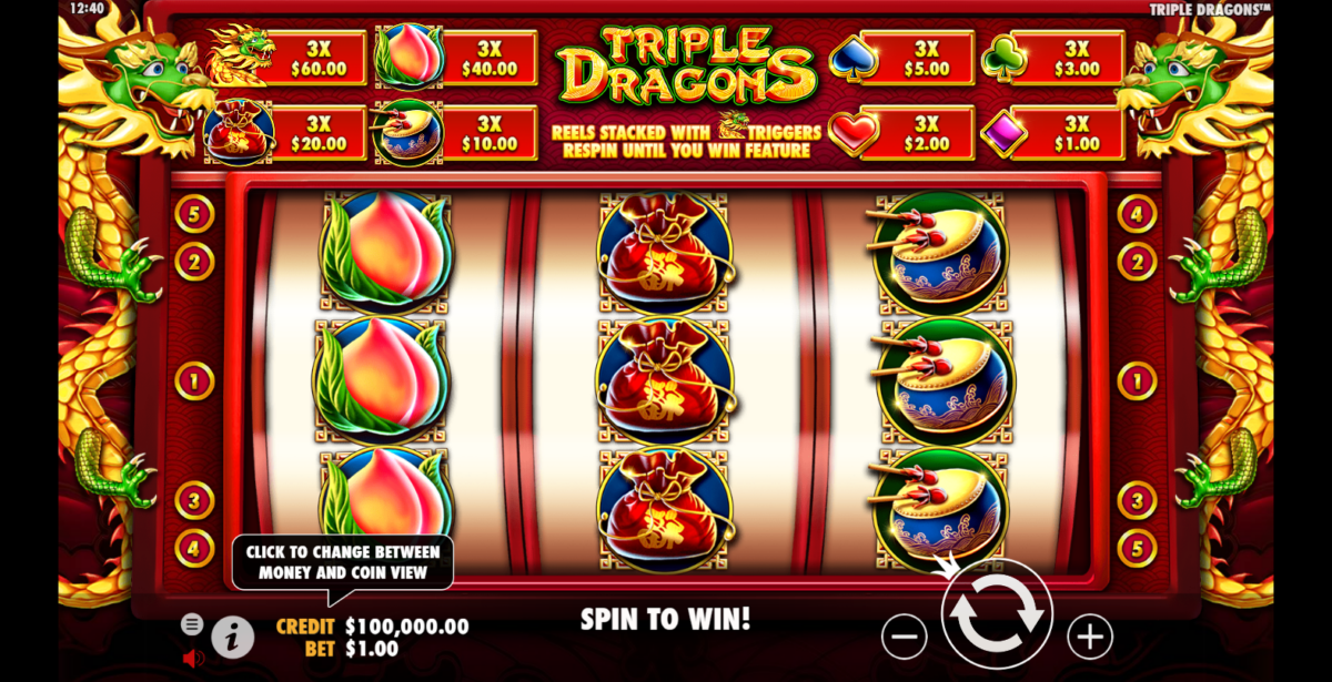 Con una temática oriental, Triple Dragon es una tragamonedas emocionante. Visita China invitado por Pragmatic Play, un desarrollador de software de juegos, y encontrarás un escenario impresionante con tonos vibrantes. Los tambores ocupan el centro preciso, y todos los botones de control relevantes están situados justo debajo de ellos.