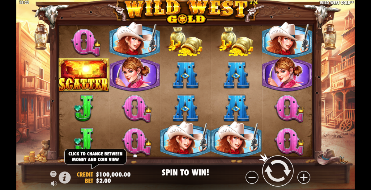 Wild West Gold es una tragamonedas muy bien desarrollada. Ambientada con excelentes gráficos que muestran un pueblo polvoriento con edificios de madera al fondo. Se aprecia la atención que los diseñadores de Pragmatic Play han puesto en cada detalle. Como la pantalla de juego que esta montada en la tabla de noticias del pueblo, rodeada de balas, sombreros y monedas.